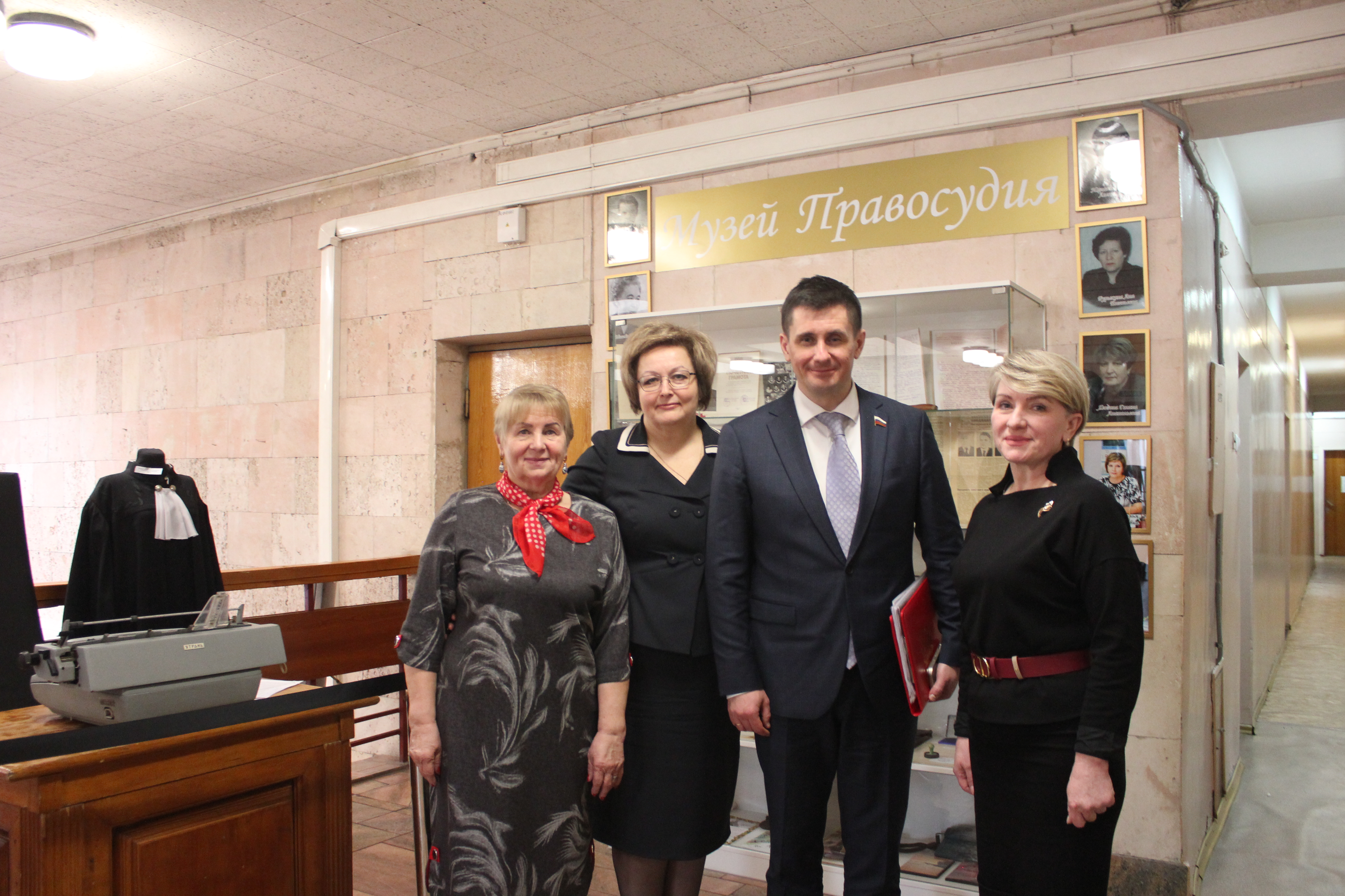 Сегодня, 31 марта, после посещения музея Иркутского областного суда сенатор Российской Федерации, член Комитета Совета Федерации по бюджету и финансовым рынкам, представитель от исполнительного органа государственной власти Брянской области Федерации Вадим Евгеньевич Деньгин отправился в Ангарский городской суд. Почетными гостями встречи также стали заместитель председателя Иркутского областного суда Светлана Алексеевна Черткова и судья Ангарского городского суда в почетной отставке Ирина Валентиновна Ягжова. В город, рожденный победой, Вадим Евгеньевич приехал неслучайно. С 1951 года в г. Ангарске осуществлял правосудие его дедушка, участник Великой Отечественной войны, Георгий Абрамович Деньгин. В архиве Ангарского суда сохранился первый приговор, вынесенный народным судьей Григорием Абрамовичем, датированный 10 декабря 1951 года. Данный судебный акт занимает важное место в музее Ангарского суда. Выставка, посвященная становлению судебной системы в г. Ангарске, была открыта всего два месяца назад. На ней представлены документы, фотографии, личные вещи и предметы судей, которые отправляли правосудие в разные годы. Центральное место занимает фотоэкспозиция, посвященная судьям-ветеранам – участникам Великой Отечественной войны и тем, кто в наши дни стоит на страже Родины – участникам специальной военной операции. Родственники многих сотрудников Ангарского городского суда сейчас находятся на передовой. К слову, Вадим Евгеньевич уделяет особое внимание поддержке бойцов и их семей. Так, одним из направлений его работы в Совете Федерации является медицинская реабилитация участников СВО. Председатель Ангарского городского суда Елена Гавриловна Бутина рассказала политику, что служители Фемиды не только отправляют в зону проведения СВО гуманитарные грузы, но и сами изготавливают необходимые бойцам вещи, шьют для раненых индивидуальные перевязочные пакеты: "Сегодня как никогда важно консолидировать усилия в поддержке военнослужащих в зоне СВО. Наш дружный коллектив просто не мог остаться в стороне: у кого-то на передовой есть родные, у кого-то — знакомые. Без долгих раздумий взялись за работу, это наша святая обязанность. В настоящее время плетем маскировочные сети и нашлемники. Хотим, чтобы ребята почувствовали нашу заботу и поддержку, и знали, что мы о них помним и ждем их".